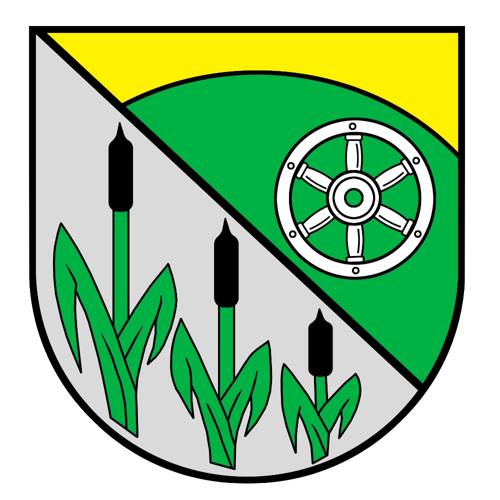 Das heutige Wappen der Gemeinde zeigt drei schwarze Rohrkolben mit grünem Stiel und je zwei Blättern sowie einen grünen Berg, in dem ein silbernes, sechsspeichiges Rad eingefügt ist.
